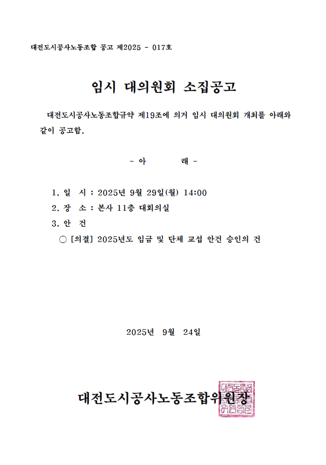 2025년 9월 임시대의원회 소집 공고(대전도시공사노동조합 공고 제2025-017호)