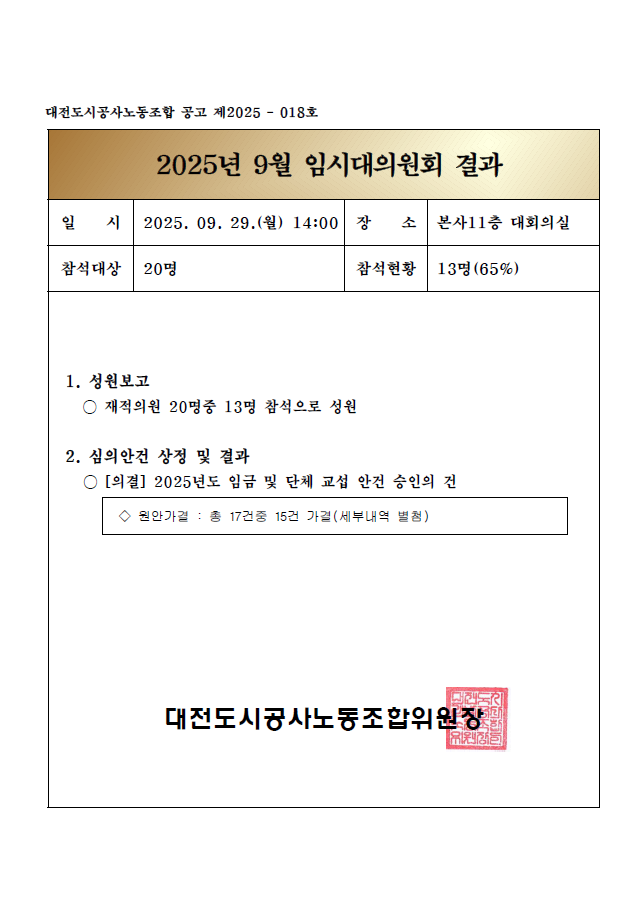 2025년 9월 임시대의원회 결과를 아래와 같이 알려 드립니다.
