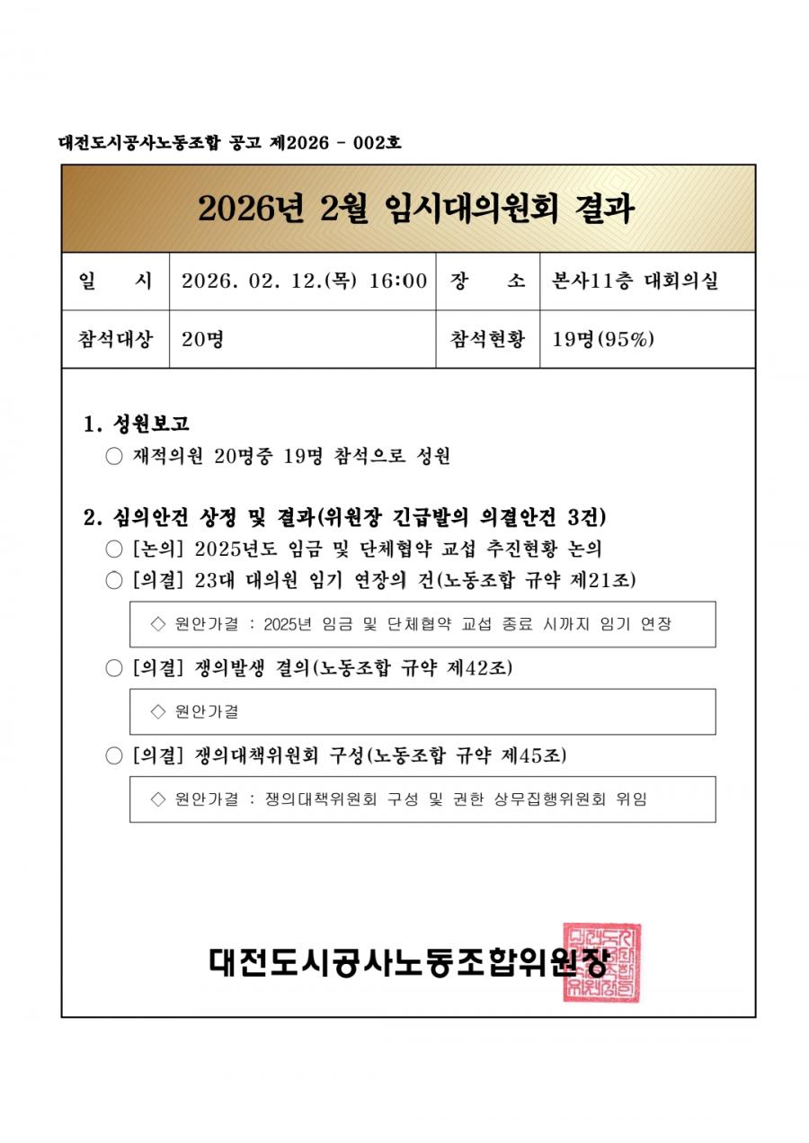 2026년 2월 임시대의원회 결과를 아래와 같이 알려 드립니다.