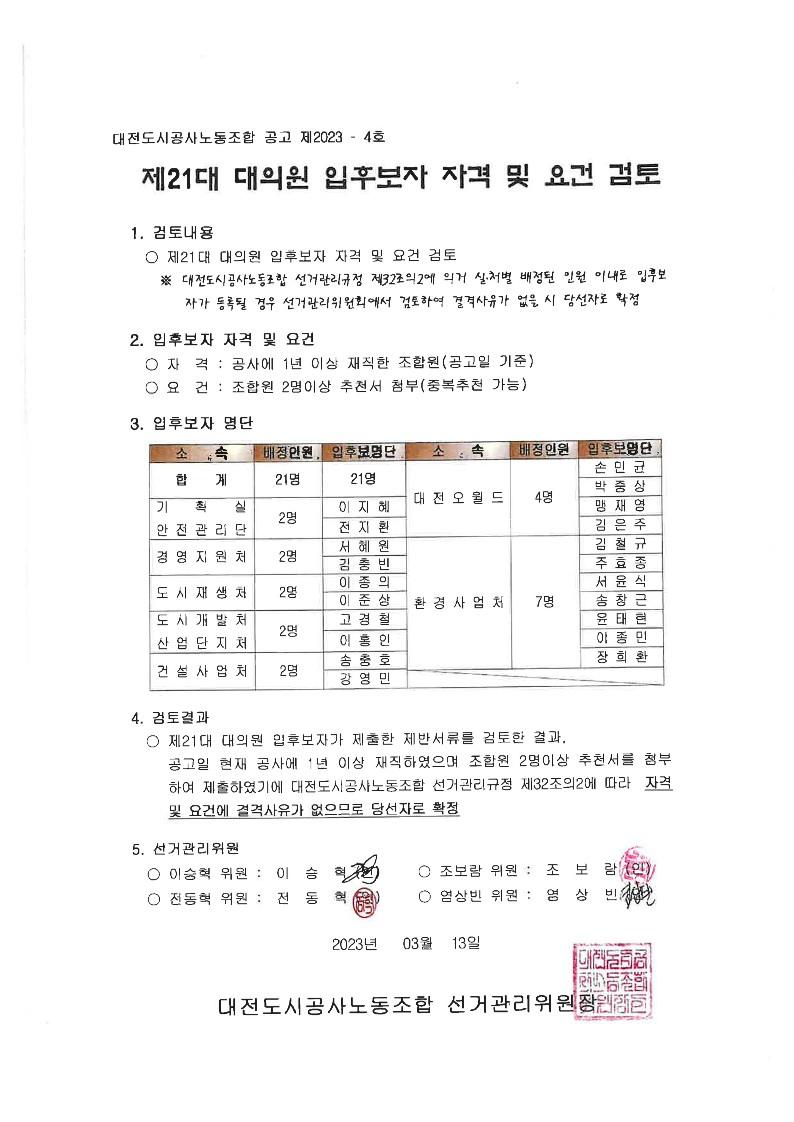 제21대 대의원 입후보자 등록 및 당선자 공고