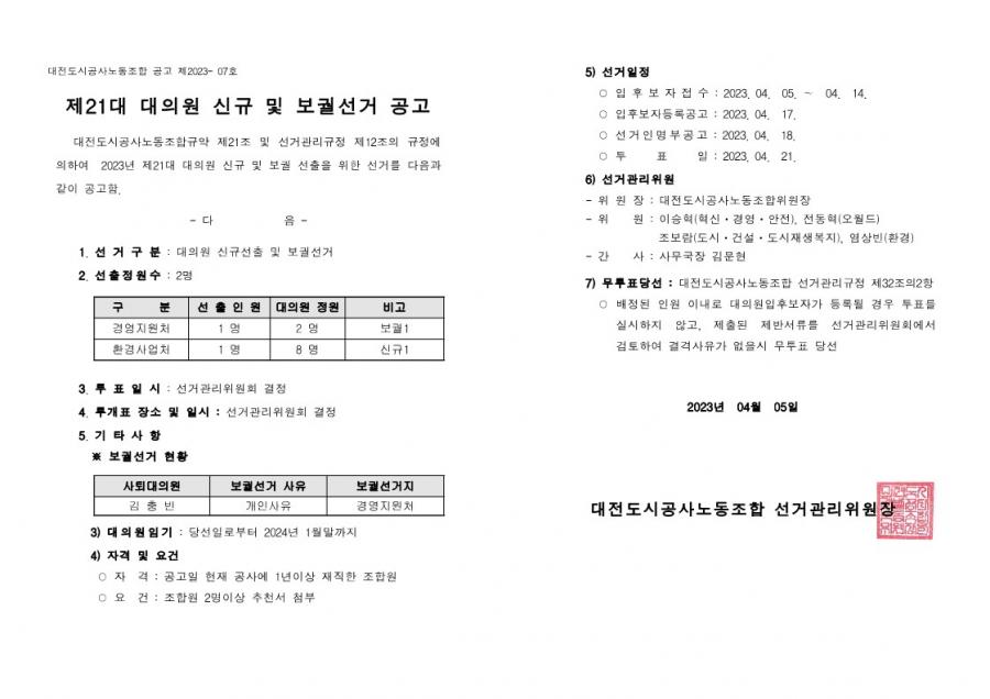 대전도시공사노동조합 2023년 제21대 대의원 신규 및 보궐 선거를