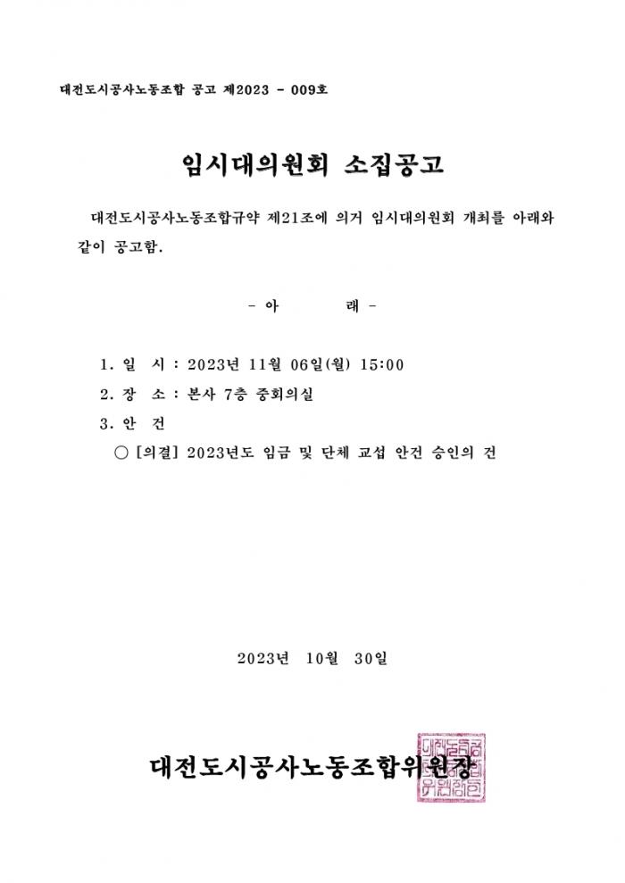 2023년 11월 임시대의원대회 소집공고 (대전도시공사노동조합 공고 제2023-09호)