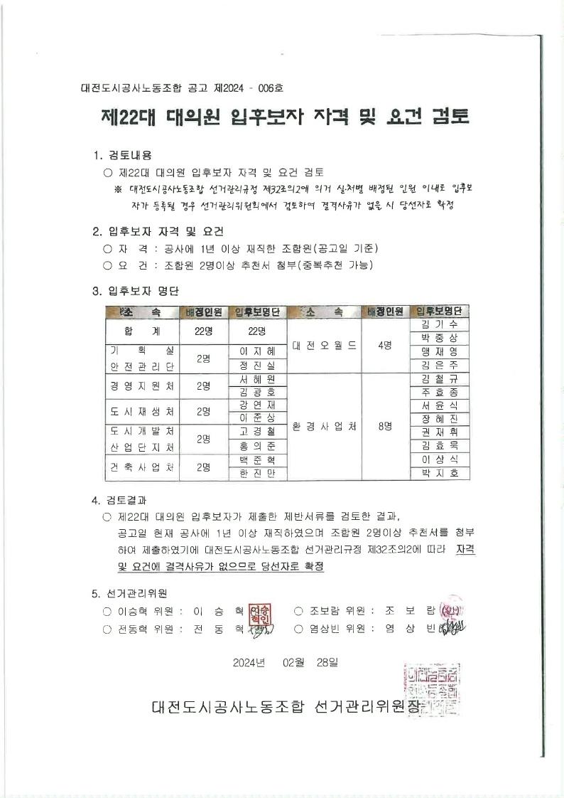 - 배정된 인원 이내로 입후보등록 되었고, 제출된 제반서류에 이상이 없어 투표를 실시하지 않고 당선자로 확정함.